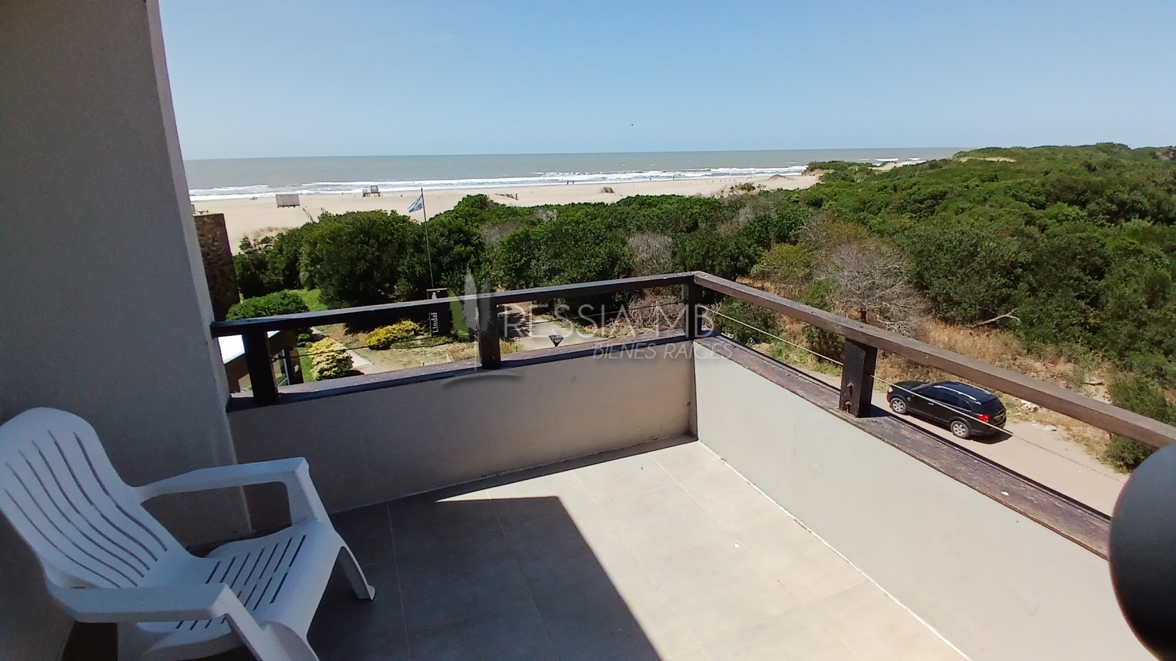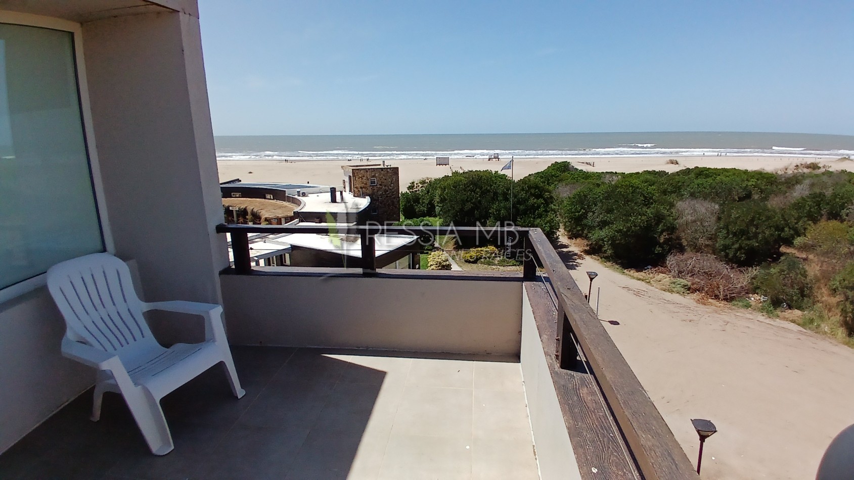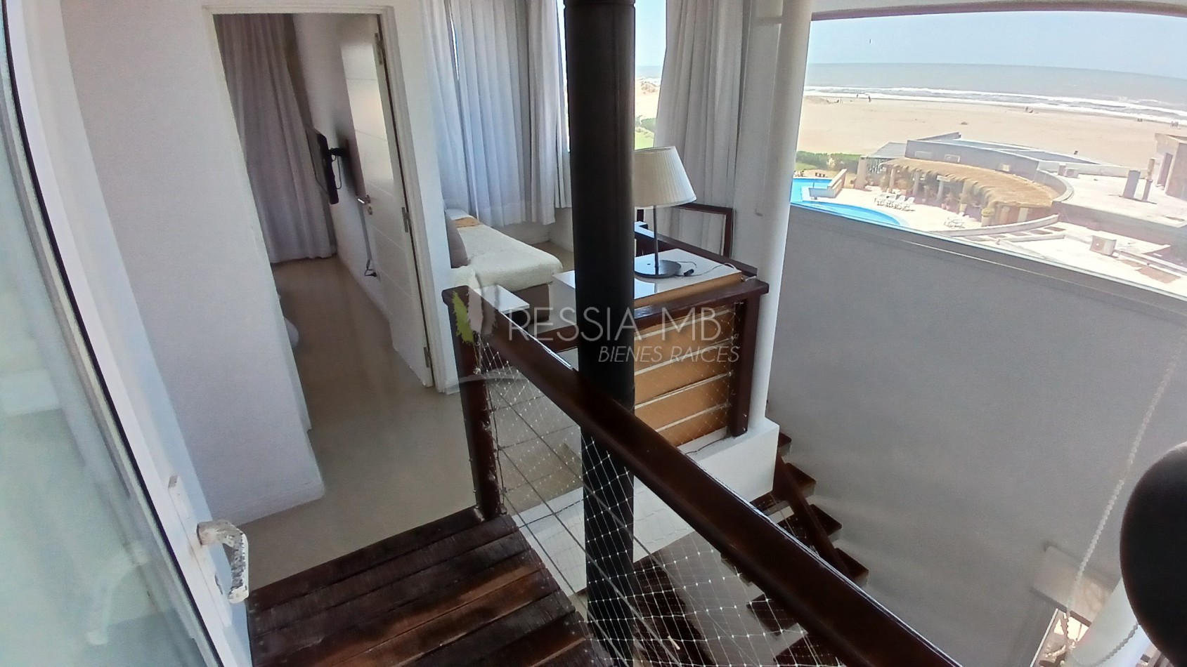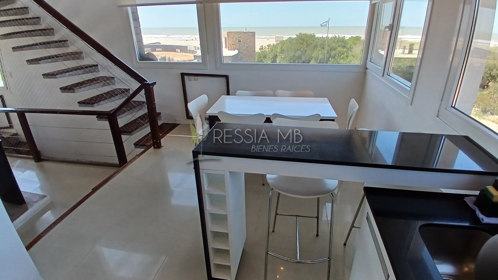 En el primer piso se encuentra el acceso principal al departamento. La cocina separada con barra desayunadora, el comedor con vista al mar y el living amplio con salida a un gran balcón generan un espacio cómodo y funcional. En este nivel también hay un baño de servicio con ducha. El balcón, uno de los puntos más destacados, ofrece un generoso espacio al aire libre con parrilla a gas y vistas abiertas hacia el interior del complejo y al mar.