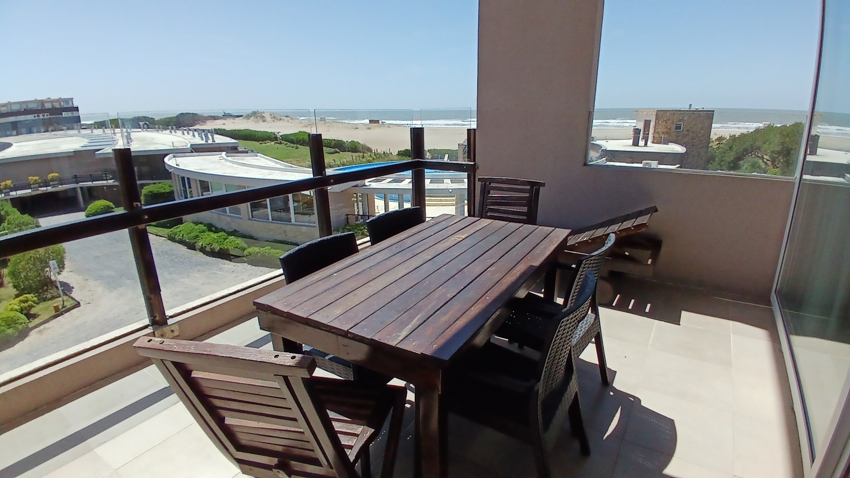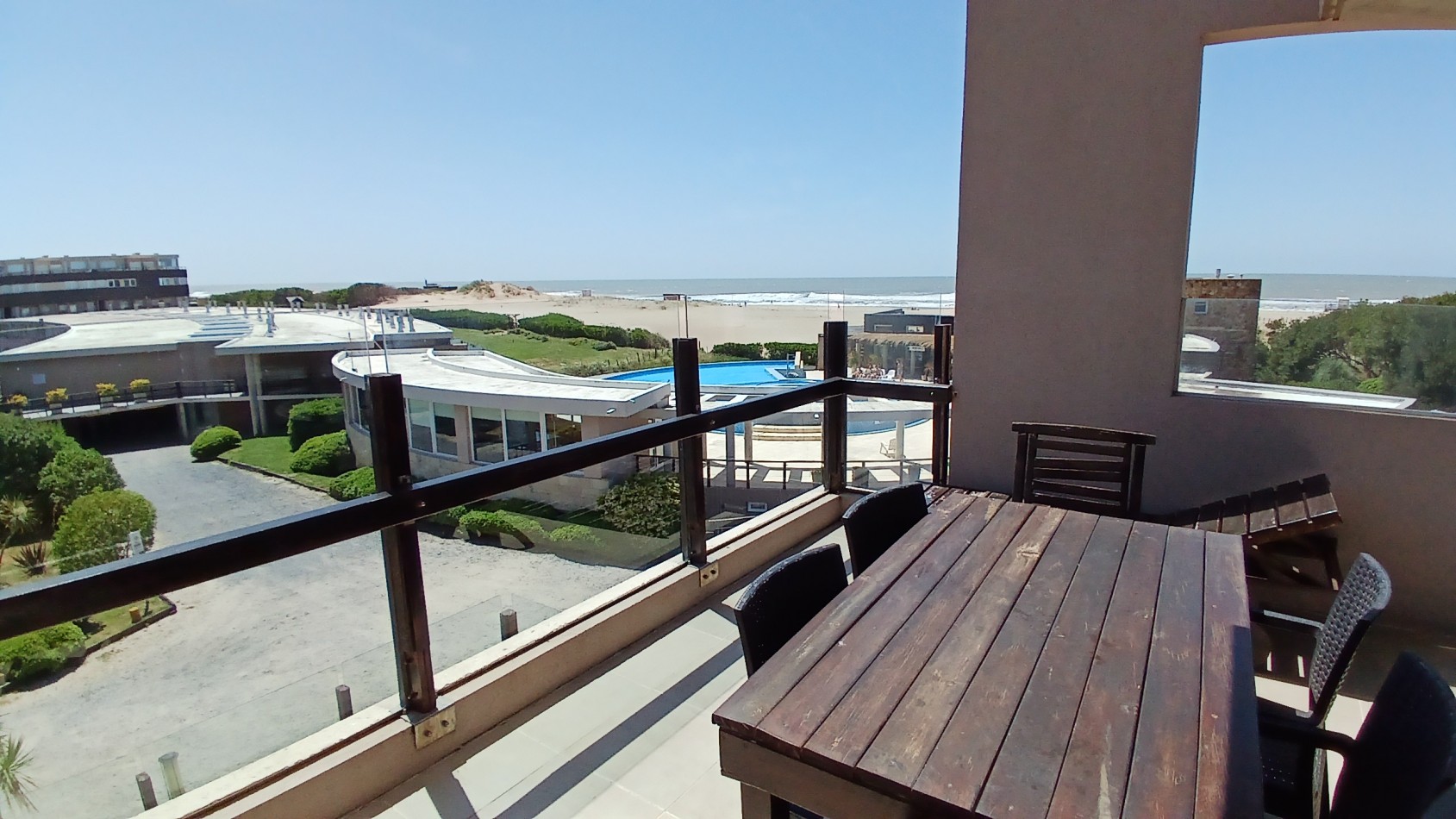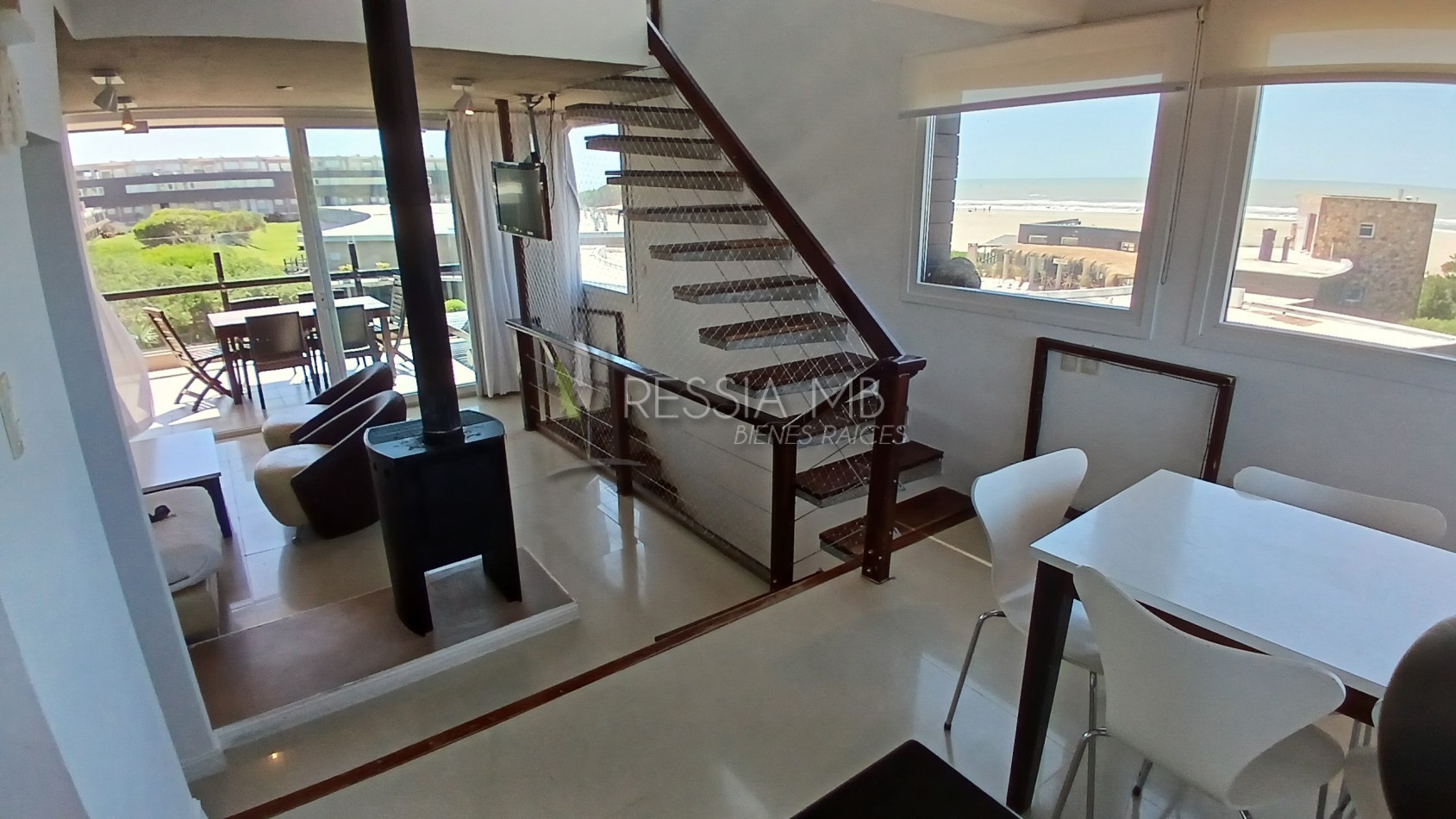 En el primer piso se encuentra el acceso principal al departamento. La cocina separada con barra desayunadora, el comedor con vista al mar y el living amplio con salida a un gran balcón generan un espacio cómodo y funcional. En este nivel también hay un baño de servicio con ducha. El balcón, uno de los puntos más destacados, ofrece un generoso espacio al aire libre con parrilla a gas y vistas abiertas hacia el interior del complejo y al mar.