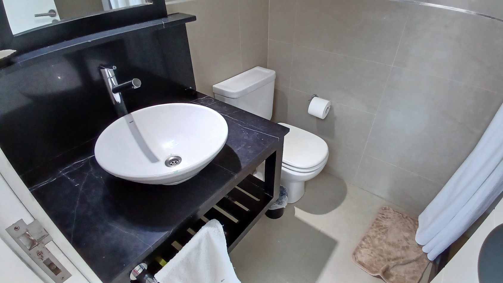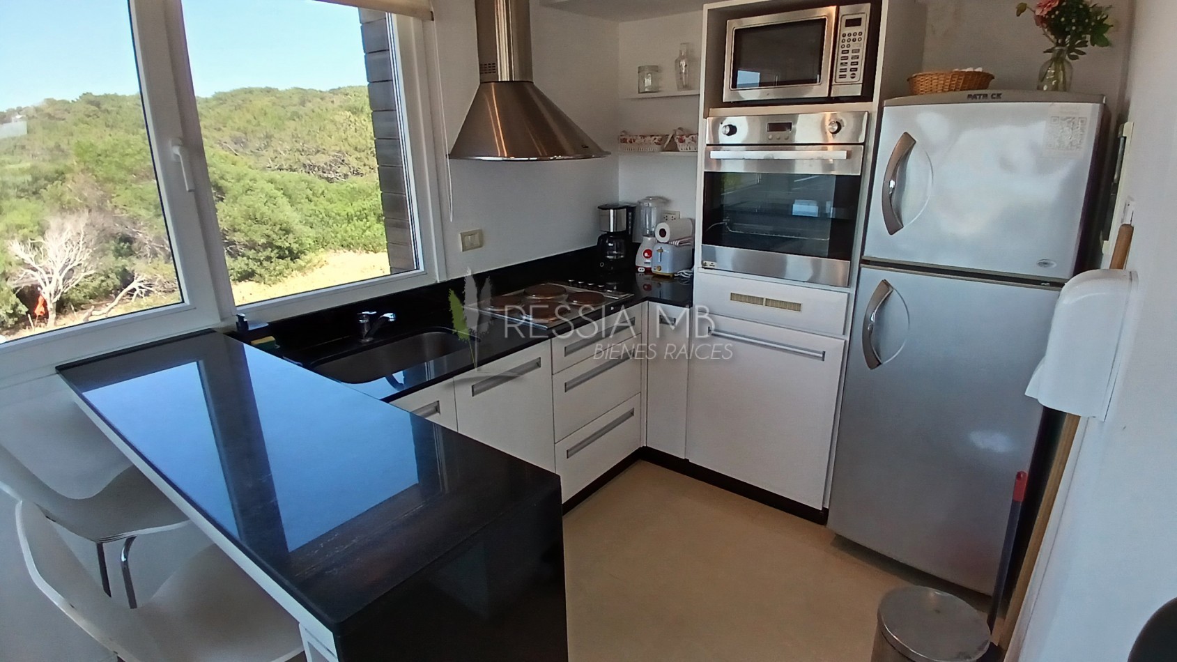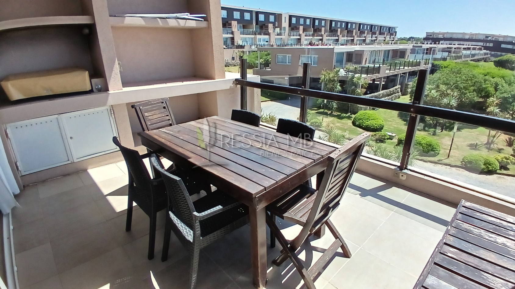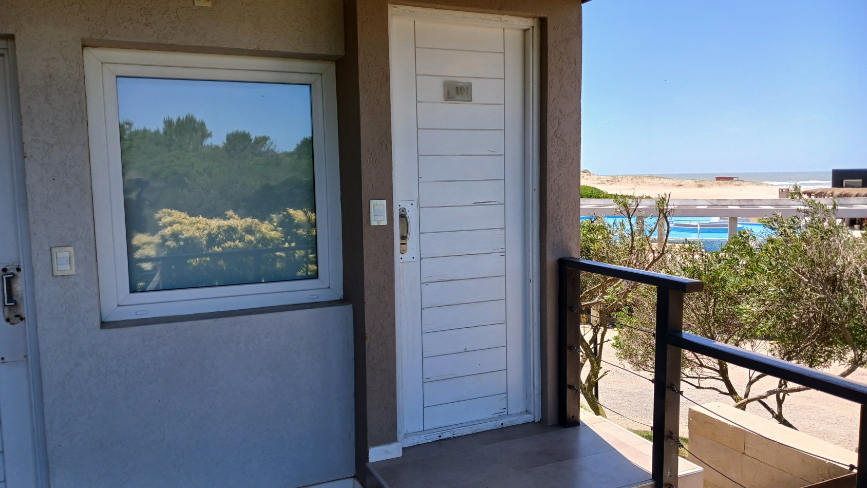 En el primer piso se encuentra el acceso principal al departamento. La cocina separada con barra desayunadora, el comedor con vista al mar y el living amplio con salida a un gran balcón generan un espacio cómodo y funcional. En este nivel también hay un baño de servicio con ducha. El balcón, uno de los puntos más destacados, ofrece un generoso espacio al aire libre con parrilla a gas y vistas abiertas hacia el interior del complejo y al mar.